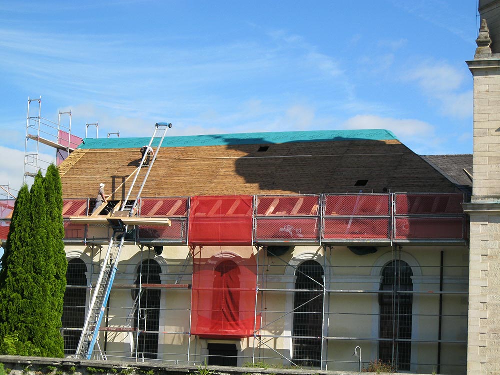 Das undichte Dach der Pfarrkirche St. Markus musste dringend saniert werden. Die vorhandene, asbesthaltige Faserzementdeckung wurde entfernt und eine Biberschwanzdoppeldeckung mit Segmentschnitt angebracht.