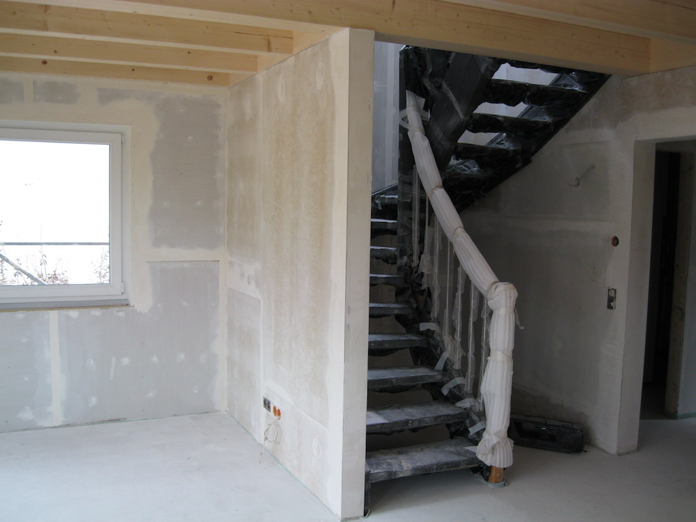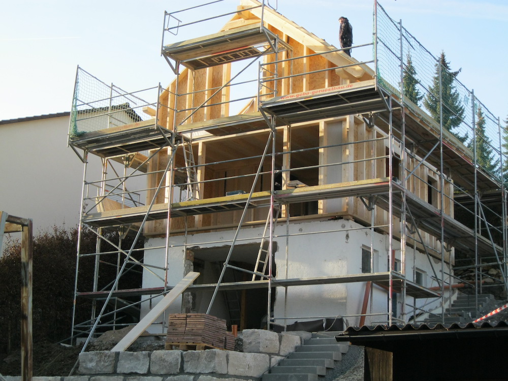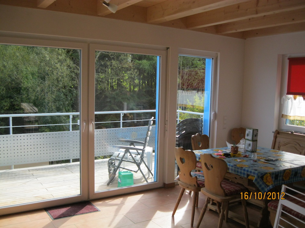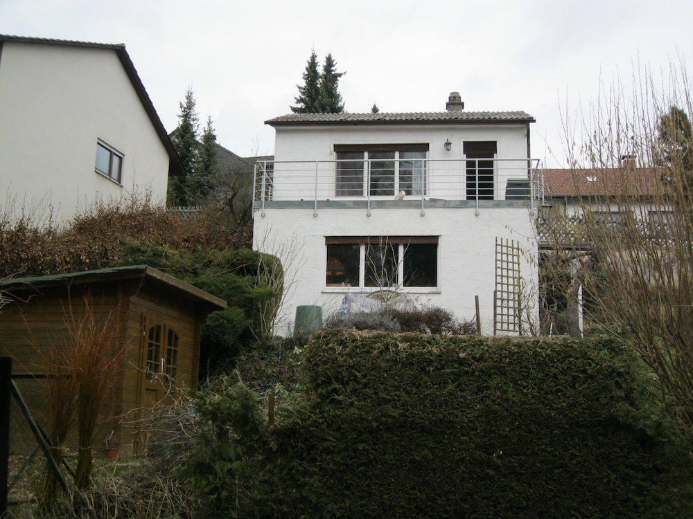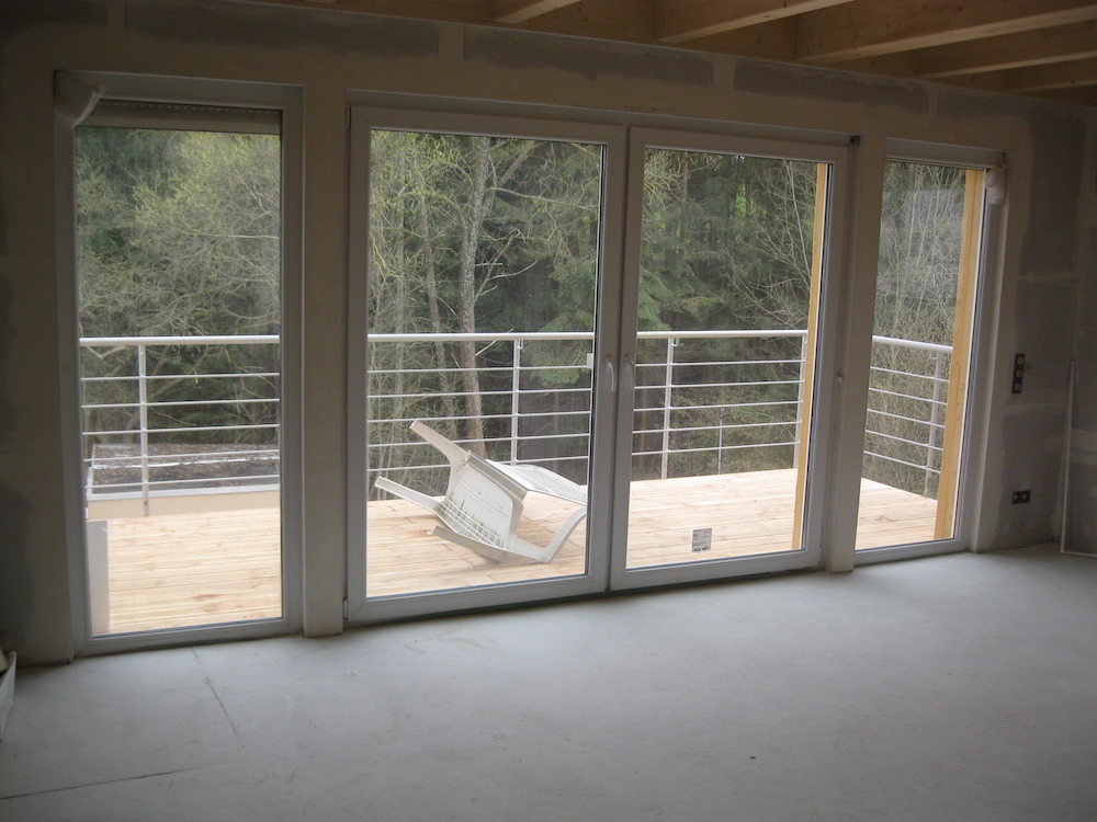 Dazu wurde das Gebüde bis auf die Kellerdecke abgebrochen und darauf ein Neubau in Holzständerbauweise erstellt. Durch die großzügige Verglasung auf der Südseite entstanden sehr helle Wohnräume mit Blick auf das benachbarte Waldgrundstück.